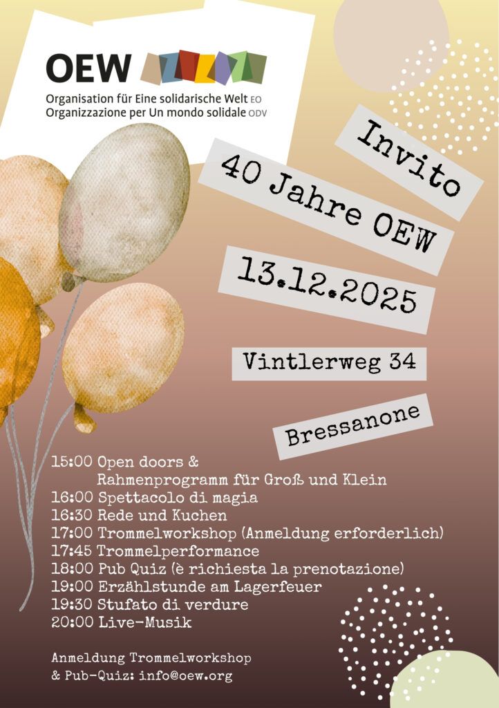 es gibt wieder einen Grund zu feiern: Vor 40 Jahren – im Jahr 1985 – begann die Geschichte der OEW im Hinterzimmer des Weltladens in Brixen, in Form einer kleinen Bibliothek. Fünf Jahre später wurde die OEW offiziell gegründet. Aus einem Ein-Personen-Projekt entwickelte sich eine lebendige Organisation mit heute 14 festen Mitarbeitenden und zahlreichen engagierten Ehrenamtlichen – lokal verwurzelt und weltweit vernetzt.
