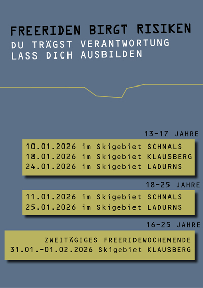 Mit den Lawinenpräventionskursen AVS Open Freeridedays will die Alpenvereinsjugend Südtirol bereits junge Freeskier:innen und Snowboarderinnen im Alter von 13-25 Jahren schon früh sensibilisieren, ihnen die Möglichkeit einer Auseinandersetzung mit den Gefahren ermöglichen, sie begleiten und bei gemeinsamen Abfahrten mit Südtiroler Bergführer:innen wichtiges Lawinen-Know-How in Theorie und Praxis vermitteln.