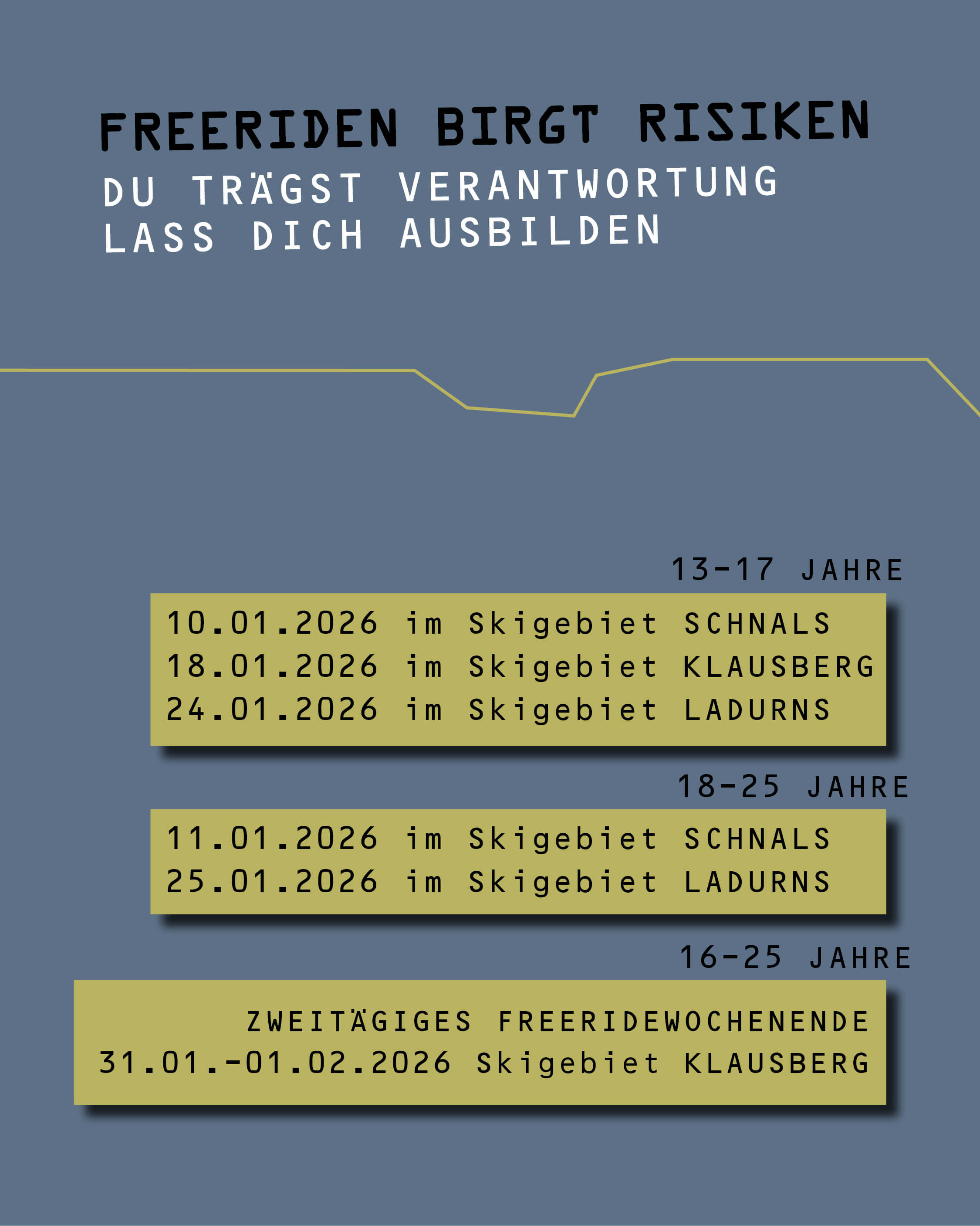 Mit den Lawinenpräventionskursen AVS Open Freeridedays will die Alpenvereinsjugend Südtirol bereits junge Freeskier:innen und Snowboarderinnen im Alter von 13-25 Jahren schon früh sensibilisieren, ihnen die Möglichkeit einer Auseinandersetzung mit den Gefahren ermöglichen, sie begleiten und bei gemeinsamen Abfahrten mit Südtiroler Bergführer:innen wichtiges Lawinen-Know-How in Theorie und Praxis vermitteln.