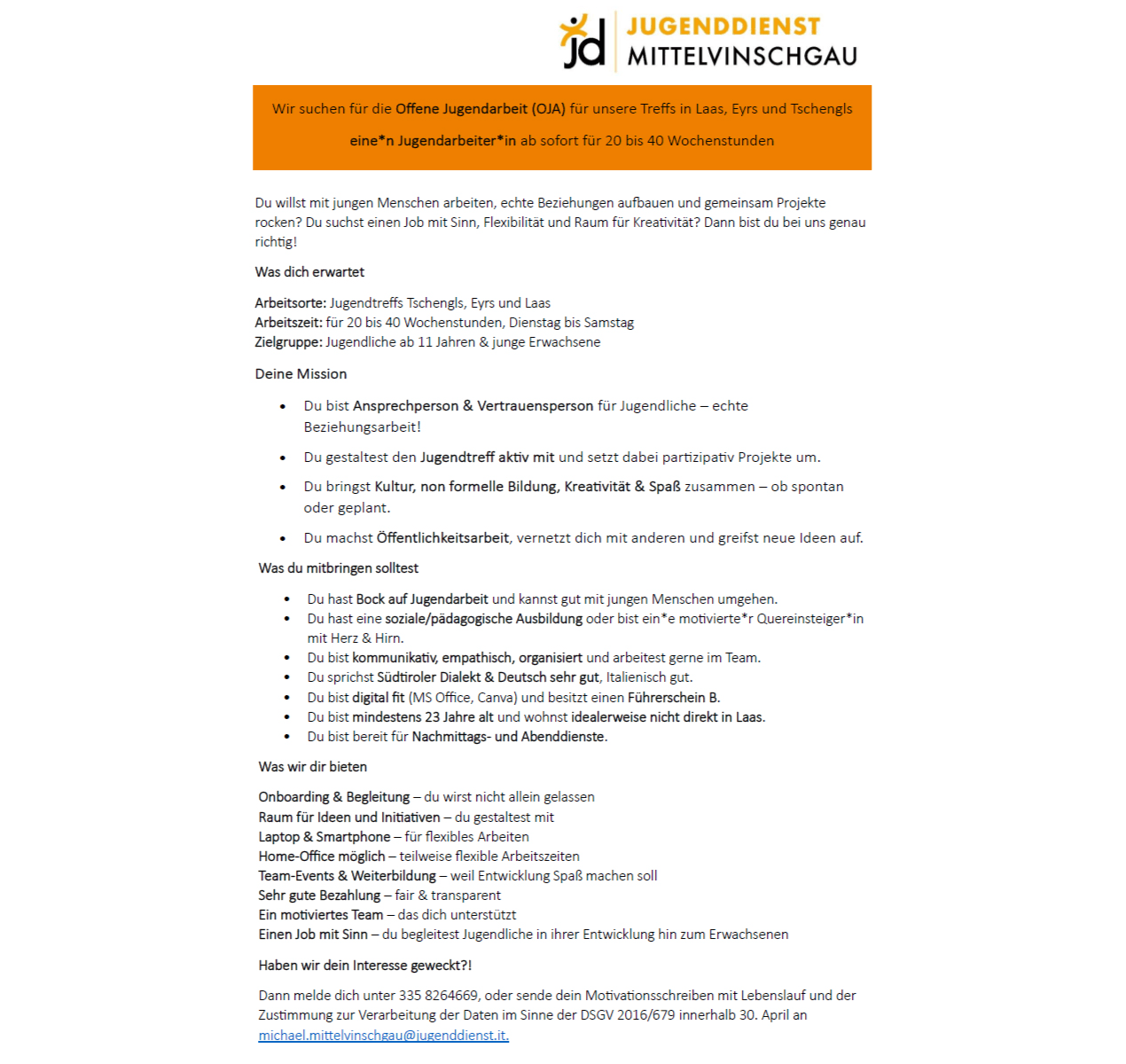 Jugenddienst Mittelvinschgau sucht