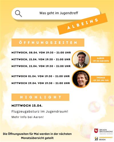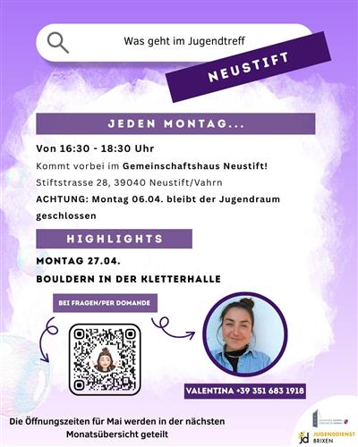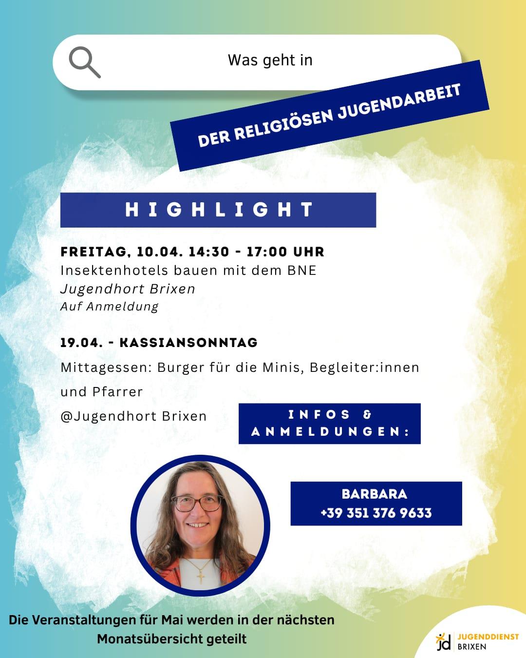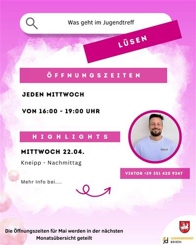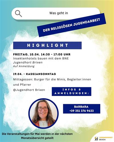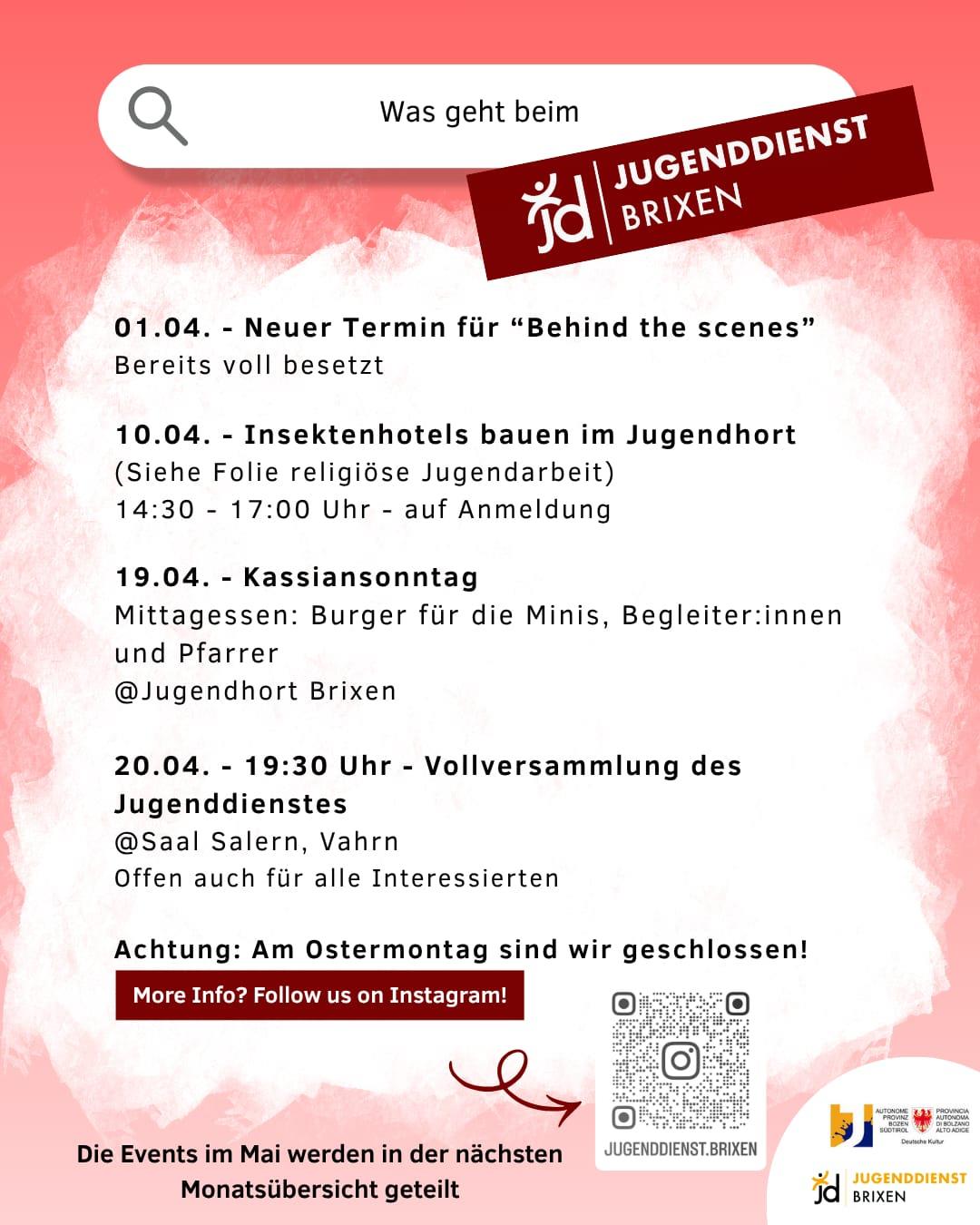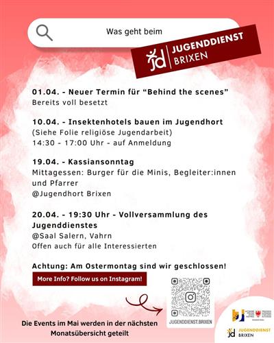 Der Jugenddienst Brixen 14 Pfarreien, 29 Gruppen, zig Aktionen und Projekte - das ist der Jugenddienst Brixen. Anmeldungen sind hier möglich: brixen.jugenddienst.it News aus dem JD Brixen Jugenddienst Brixen Termin 09.05.2026 Workshop: Demokratie stärken Jugenddienst Brixen News 29.03.2026 Der Jugenddienst Brixen lädt ein: Filmnachmittag mit Tiefgang Jugenddienst Brixen Termin 19.04.2026 Kassiansonntag mit Mittagessen im Jugendhort Jugenddienst Brixen News 14.03.2026 „Wild und Echt – A Tog für di“ Jugenddienst Brixen Termin 01.04.2026 Behind the scenes: Workshop zu Körper & Sex in Medien Jugenddienst Brixen News 10.03.2026 „Jedes Gefühl isch a Guates Gefühl“ – Vortrag von Emi Massmer über den Umgang mit Depression Jugenddienst Brixen News 06.03.2026 Multivisionsshow mit Justine Markart – Abenteuer, Hoffnung, Vertrauen Jugenddienst Brixen Termin 14.03.2026 und 21.03.2026 Wildnispädagogischer Workshop "Wild und Echt" Jugenddienst Brixen News 27.02.2026 Besuch im Tertiarkloster Brixen Jugenddienst Brixen News 11.02.2026 Gemeinsam zum Serie-B-Highlight: Jugenddienst Brixen beim Spiel des FC Südtirol gegen AC Monza Jugenddienst Brixen News 23.01.2026 Biblische Texte neu entdeckt Jugenddienst Brixen News 19.12.2026 Ein voller Erfolg! Die Weihnachtsfeier "Christmas Vibes - Winter Warm Up" Jugenddienst Brixen Meldung Sommer 2026 Sommerwochen JD Brixen KDS Jugenddienst Brixen Termin Save the Date: 07.02.26 Was bleibt? – Tagesausflug zur KZ-Gedenkstätte Dachau Jugenddienst Brixen Termin Christmas Vibes Winter Warm Up Jugenddienst Brixen News Zeitreiße in die Barockbibliothek Jugenddienst Brixen Meldung 13.11.2025 Nacht der 1000 Lichter Jugenddienst Brixen Meldung 28.10.2025 Pilgern ins Gadertal zum Heiligen Josef Freinademetz am 25.10. Jugenddienst Brixen News 28.10.2025 GARDALAND HALLOWEEN SPECIAL ein voller Erfolg! Jugenddienst Brixen Meldung Jugenddienst Brixen Neue Mitarbeiterin: Nicole Linter Jugenddienst Brixen Meldung Jugenddienst Brixen Neuer Mitarbeiter: Viktor Reiterer Jugenddienst Brixen Meldung Jugenddienst Brixen Neue Mitarbeiterin: Barbara Lobis Ploner Jugenddienst Brixen Meldung Jugenddienst Brixen Neue Mitarbeiterin: Evelyn Götsch Jugenddienst Brixen Meldung Jugenddienst Brixen Neue Mitarbeiterin: Valentina Baviera Jugenddienst Brixen Meldung Jugenddienst Brixen Neue Mitarbeiterin: Vera Obexer Was geht in unseren Jugendtreffs?