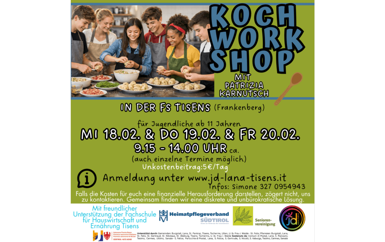 Kochworkshop Anmeldung Vorname, Nachname Teilnehmer*in / nome, cognome partecipante Geburtsdatum Teilnehmer*in / data di nascita partecipante Wohnort / residenza Telefonnummer Teilnehmer*in / Numero di telefono partecipante Es ist ok für mich, wenn über Whatsapp kommuniziert wird. / Va bene per me, se la comunicazione avviene via whatsapp. ja / sì nein / no 18.02.2026 Brennsuppe Stockfischgröstl, Gröstl mit Kräutersaitlingen Vinschger Schneemilch 19.02.2026 Speckknödelsuppe Spinat- und Rohnenknödel mit Käsekern und Krautsalat Topfenknödel auf karamellisierten Apfelwürfeln 20.02.2026 Topfenschmarrn Schwarzplentener Ribl mit Apfel-Presiselbeer-Würfel Kaiserschmarrn mit Apfelmus Bemerkungen (z.B. Allergien, Intoleranzen, Krankheiten, Wichtiges, etc.) / Osservazioni (per esempio allergie, intolleranze, malattie, cose importanti, ecc.) Email Datenschutz Ich nehme zur Kenntnis, dass die Verarbeitung der personenbezogenen Daten ausschließlich zur Abwicklung des Programmes und zur Erfüllung der gesetzlichen Pflichten erfolgt. Das Datenschutzinformationsblatt gemäß der Europäischen Datenschutzgrundverordnung (DSGVO 679/2016) finden Sie hier. Protezione dei dati Prendo atto che i dati personali saranno trattati esclusivamente per la gestione del programma e per l'adempimento degli obblighi legali. Cliccare qui per l'informativa sulla protezione dei dati ai sensi del Regolamento generale (EU) sulla protezione dei dati (RGPD 679/2016). Verarbeitung von Gesundheitsdaten Für die Teilnahme an der Aktion ist die Verarbeitung nötig. Da es sich um besonders schützenswerte Daten handelt, ist die Einwilligung der erziehungsberechtigten Person notwendig. Die erziehungsberechtigten Personen willigen durch Anklicken der Checkbox ein, dass der JD Lana-Tisens die Gesundheitsdaten des/r Teilnehmers*in zu den in Punkt 9 des Datenschutzinformationsblatt genannten Zwecke verarbeiten darf. Trattamento dei dati sanitari L'elaborazione è necessaria per la partecipazione al evento. Trattandosi di dati particolarmente sensibili, è necessario il consenso della persona che esercita la patria potestà. Cliccando sulla casella di controllo, il genitore o il tutore, acconsente al trattamento dei dati sanitari del partecipante da parte del JD Lana-Tisens per gli scopi indicati al punto 9 dell'informativa sulla protezione dei dati. Öffentlichkeitsarbeit – Fakultative Einwilligung Es ist ein Anliegen des JD Lana-Tisens, dessen Tätigkeit auch der Öffentlichkeit vorzustellen. Da die Erfüllung dieses Anliegens nicht notwendig für die Teilnahme an den Aktionen ist, bedarf es einer ausdrücklichen Einwilligung seitens der erziehungsberechtigten Personen. Die erziehungsberechtigten Personen willigen mittels Anklicken der entsprechenden Checkbox ein, dass der Name und der Nachname sowie das Lichtbild für die in Punkt 10 genannten Zwecke in den dort genannten Medien verwendet werden können. Relazioni pubbliche - Consenso opzionale È nell’interesse del JD Lana-Tisens presentare le proprie attività al pubblico. Poiché l’adempimento di tale interesse non preclude la partecipazione agli eventi , si necessita del consenso esplicito delle persone che hanno la potestà genitoriale. Cliccando sulla casella di controllo corrispondente, il genitore o il tutore, acconsente all'utilizzo del proprio nome e cognome e della propria foto per gli scopi indicati al punto 10 nei media ivi menzionati. Anmelden / Invia Fahrplan St.Felix-Lana Fahrplan Ulten-Lana Fahrplan Lana-Tisens Fahrplan Lana-Völlan