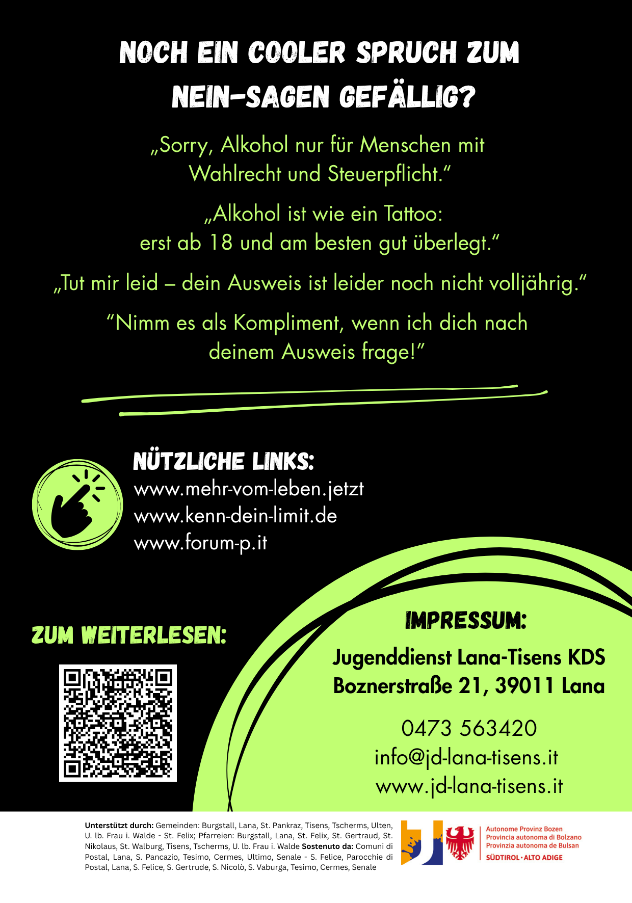 Gerne stellen wir unsere Plakate (A2 Format), Getränkeuntersetzer und Broschüre auch in gedruckter Form zur Verfügung. Meldet euch einfach im Büro unter 0473 563420.