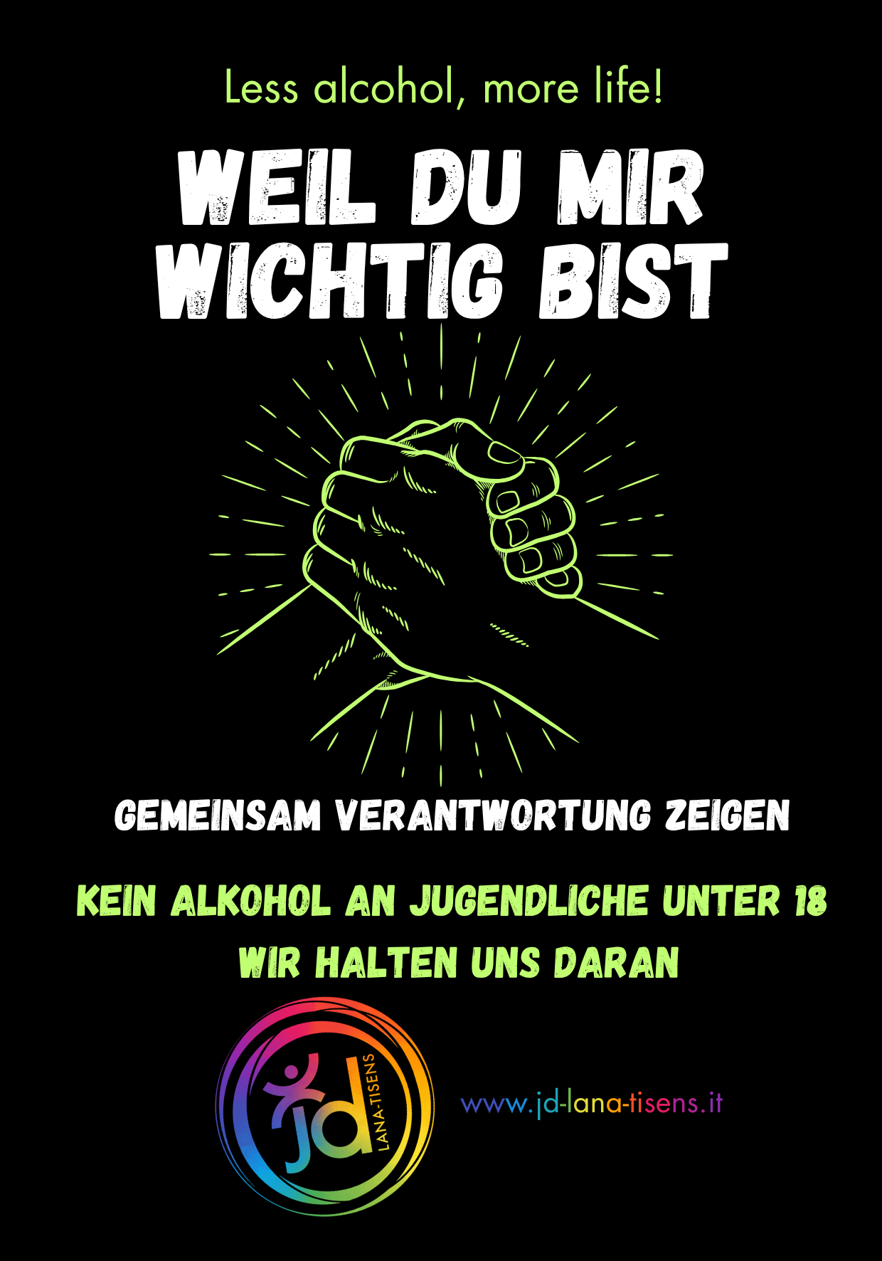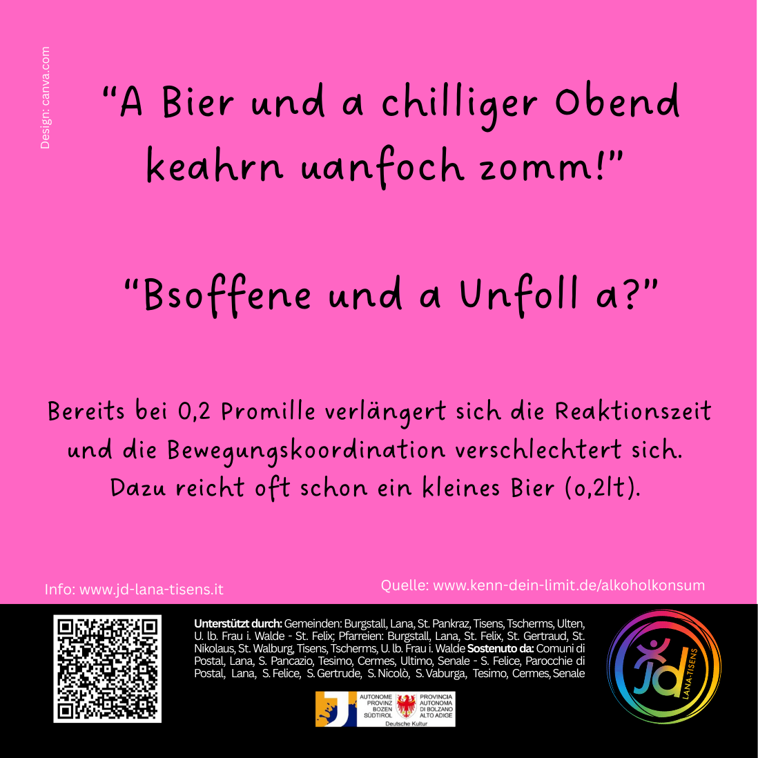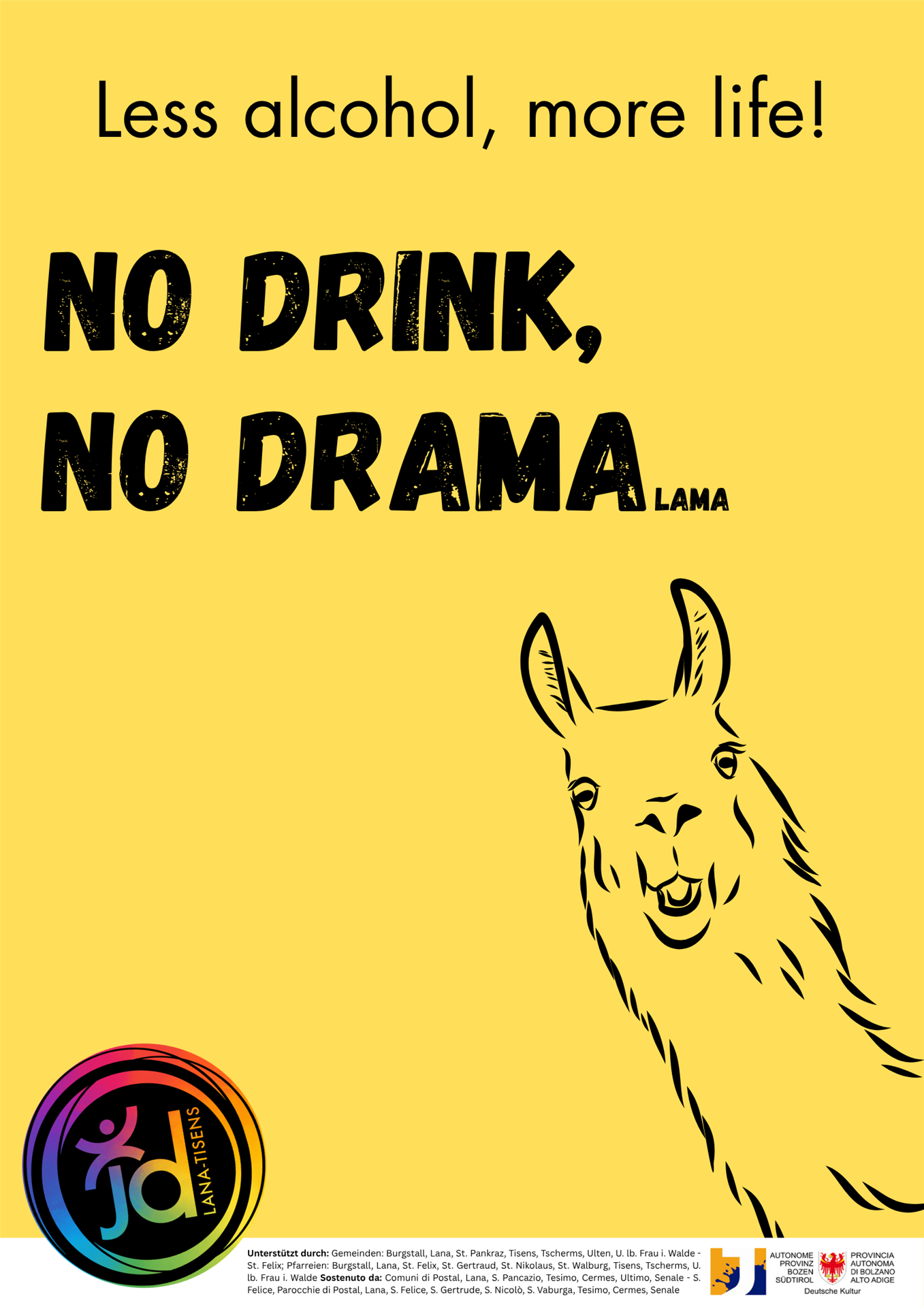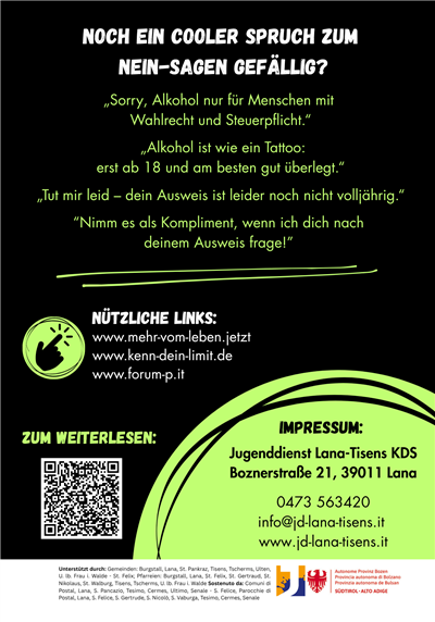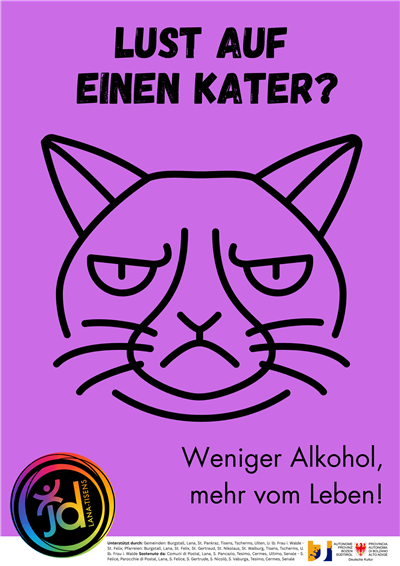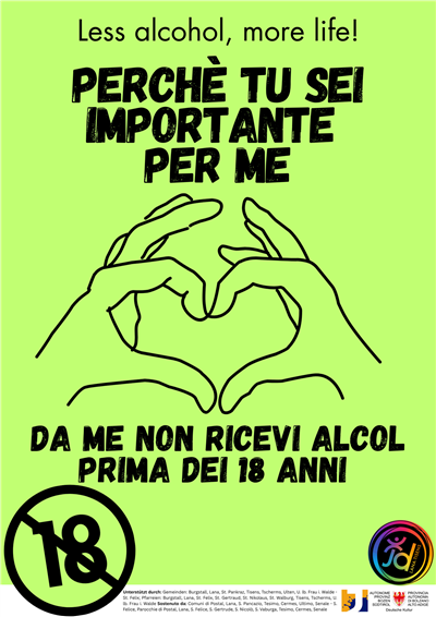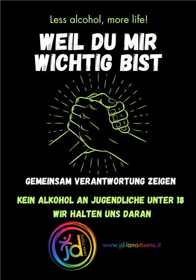 Wir bieten für die 3. Klassen der Mittelschulen unserer Mitgliedsgemeinden ein Projekt zur Alkoholprävention an. Dauer ca. 1,5 Stunden. Bei Interesse meldet euch gerne bei Christian unter 3297549554 oder christian@jd-lana-tisens.it