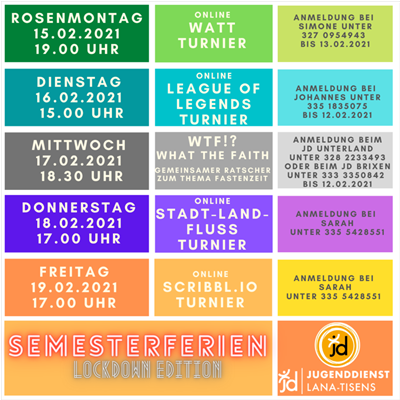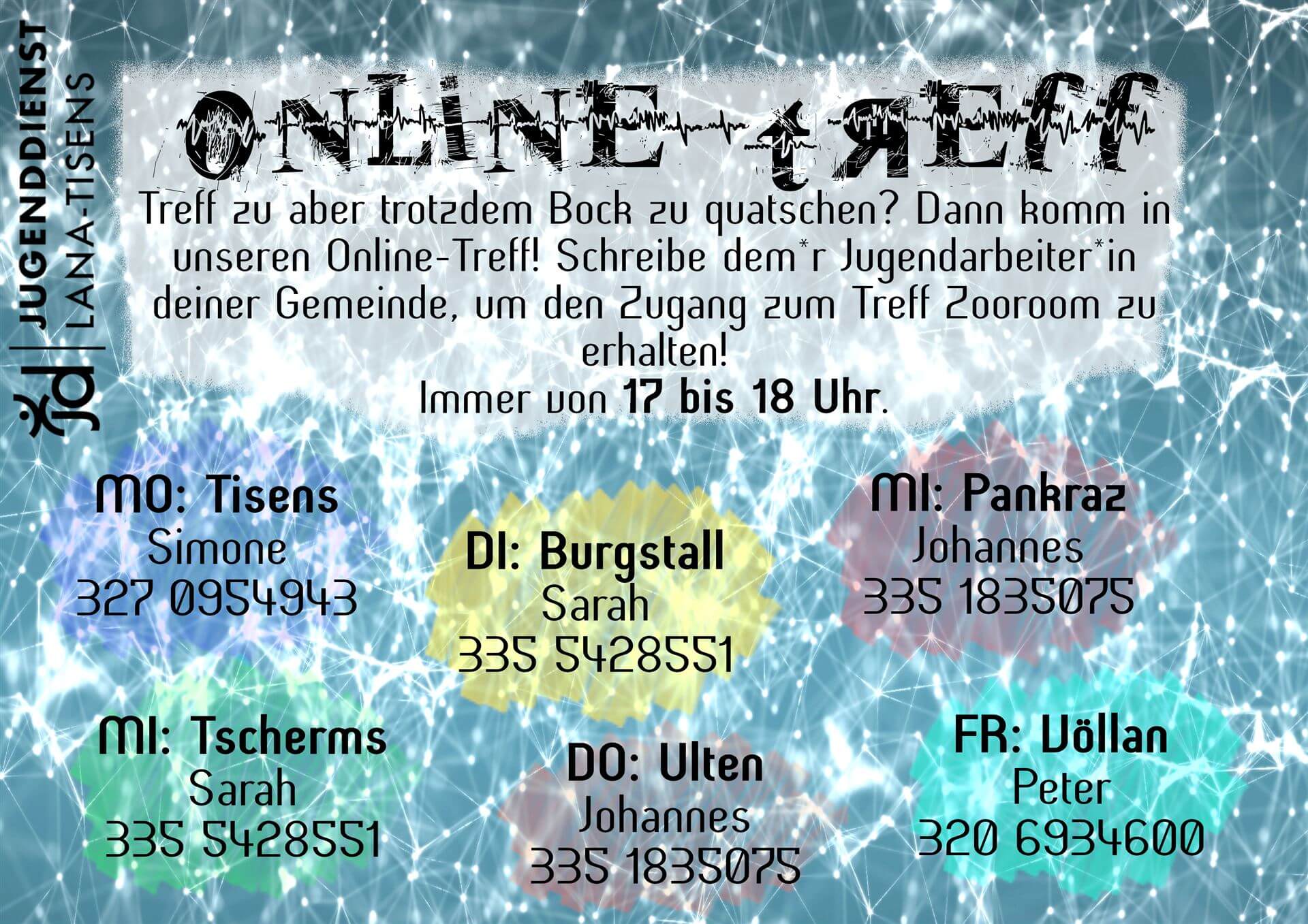 In der virtuellen Treff - Öffnungszeit sind die Jugendarbeiter*innen online. Der Onlinetreff kann jederzeit von euch Jugendlichen besucht werden und wir können uns dort „treffen“ und austauschen. Weiters bieten wir immer wieder verschiedene Spiele und Challenges, um gemeinsam Spaß zu haben und aktiv etwas zu machen. Alle Aktionen, die virtuell stattfinden, könnt ihr auf den Social-Media Plattformen unter den Hashtags #VIRTojaL und #JugenddienstLanaTisens finden.