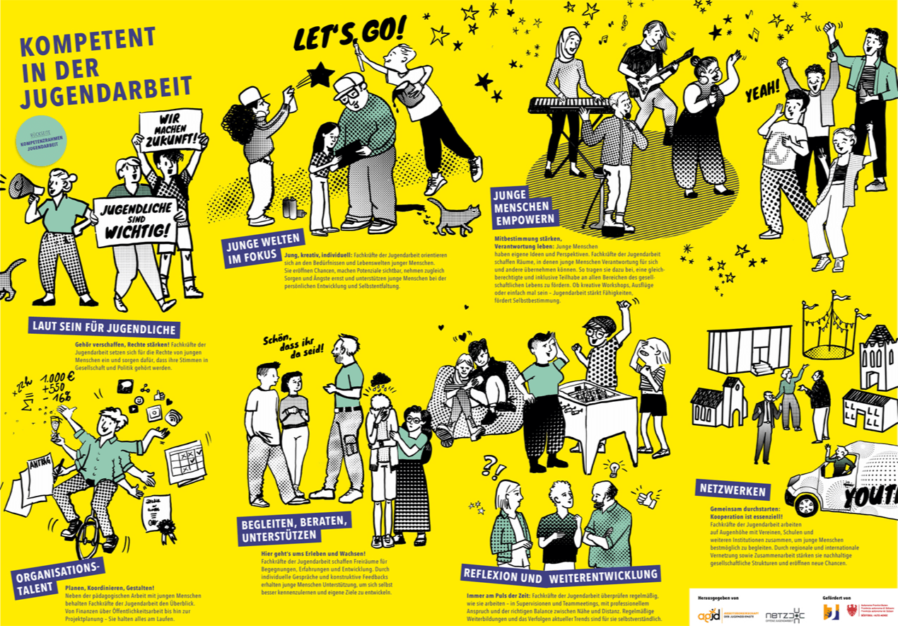 - macht die vielfältigen Aufgaben und Kompetenzen von Jugendarbeiter:innen sichtbar,