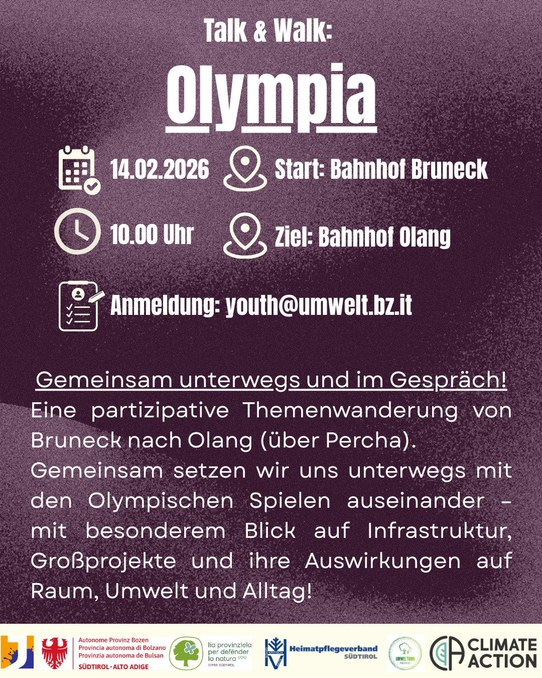 Olympia. Dafür werden die unfertigen Olympia-Projekte entlang der Pustertaler Straße begutachtet und als Denk- und Gesprächsanstoß genutzt. Dabei werden während des Gehens Informationen ausgetauscht und über die Auswirkungen von Olympia auf Mensch und Umwelt reflektiert.
