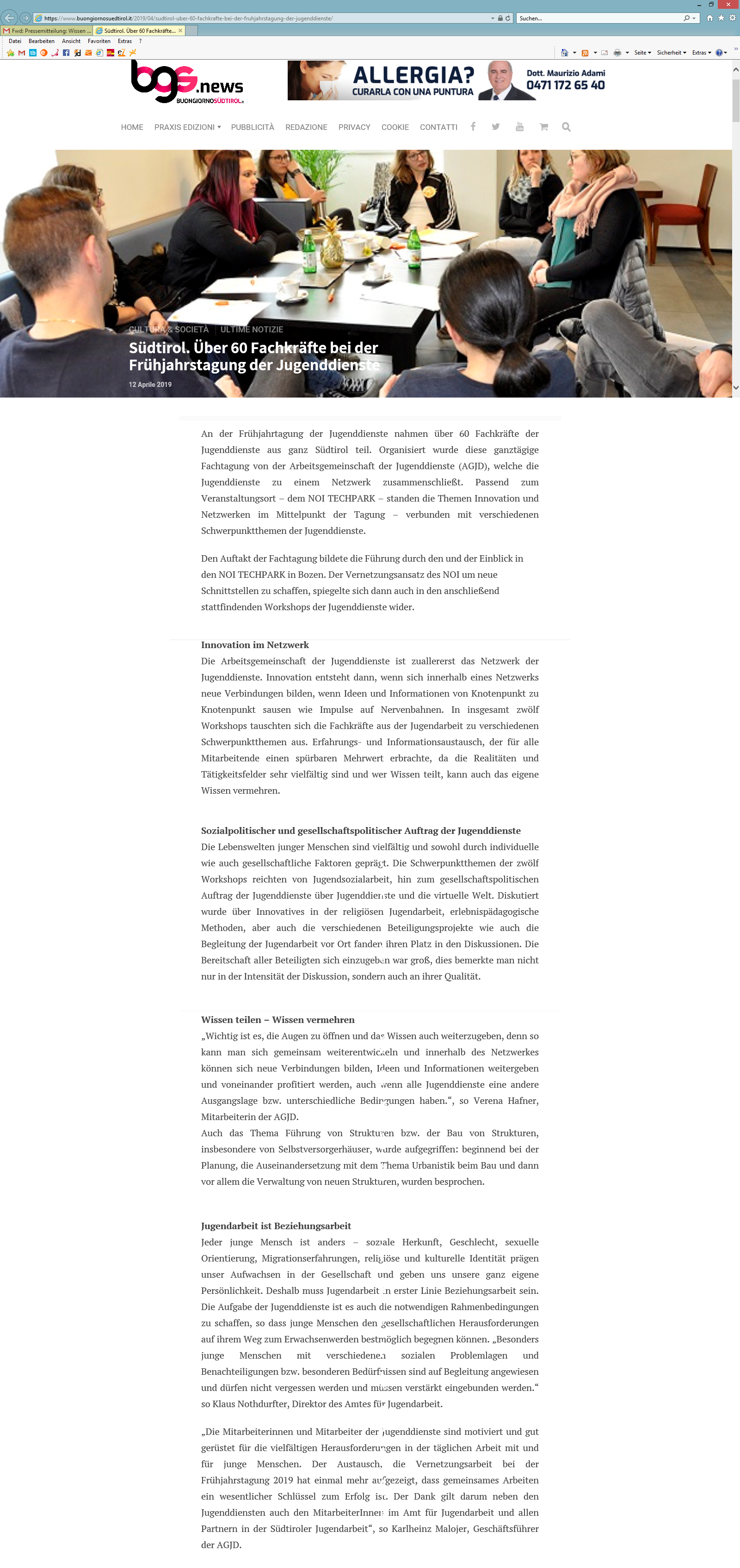Pressemitteilung Pressemitteilung: FRÜHJAHRSTAGUNG der Arbeitsgemeinschaft der Jugenddienste Pressespiegel Dolomiten (23.04.2019) stol (16.04.2019) Südtirol News (12.04.2019) Buongiorno Südtirol (15.04.2019)