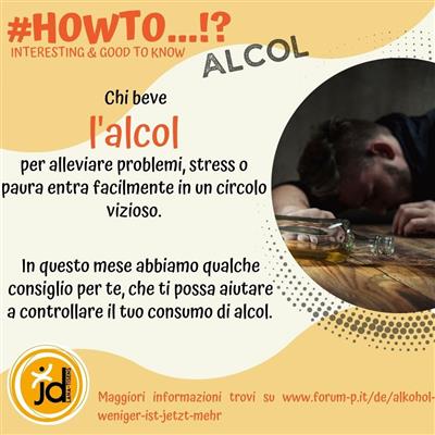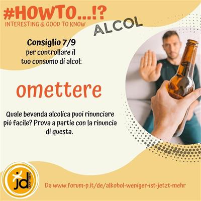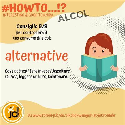 Bei Informationen zu Alkohol, Zweifel, Fragen oder Sorgen um eine nahestehende Person, kannst du dich für eine Erstberatung an das Forum Prävention wenden. Von Mo-Fr von 9-12 Uhr unter 0471 324 801 oder per Mail an info@forum-p.it. Weitere nützliche Kontakte gibt es auf der Website "Du bist nicht allein!"