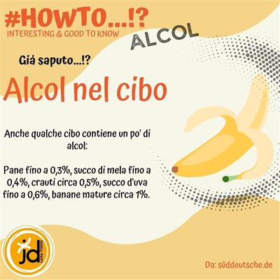 Auch Nahrungsmittel enthalten etwas Alkohol. Ein paar Beispiele, Alkoholangabe in Volumenprozent: Brot bis zu 0,3, Apfelsaft bis zu 0,4, Sauerkraut etwa 0,5, Traubensaft bis zu 0,6, reife Bananen etwa 1.